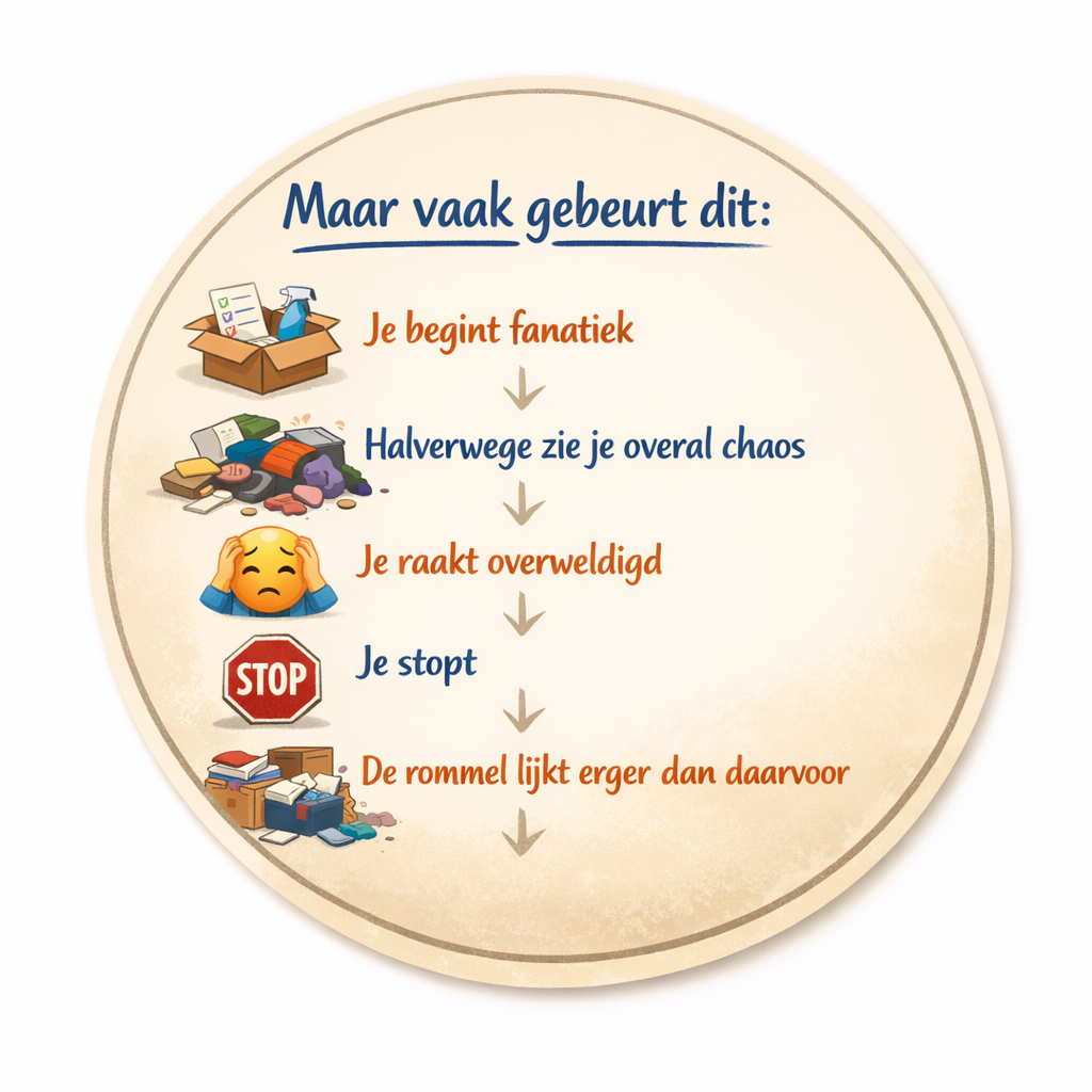 Maar minstens zo vaak gebeurt er iets anders. Je begint fanatiek, maar halverwege zie je alleen nog maar méér chaos. Overal liggen spullen. De keuzes worden moeilijker. Je raakt overweldigd. En voordat je het weet, stop je.